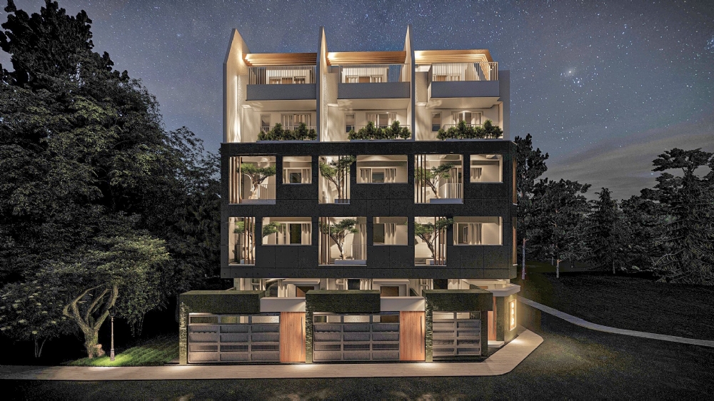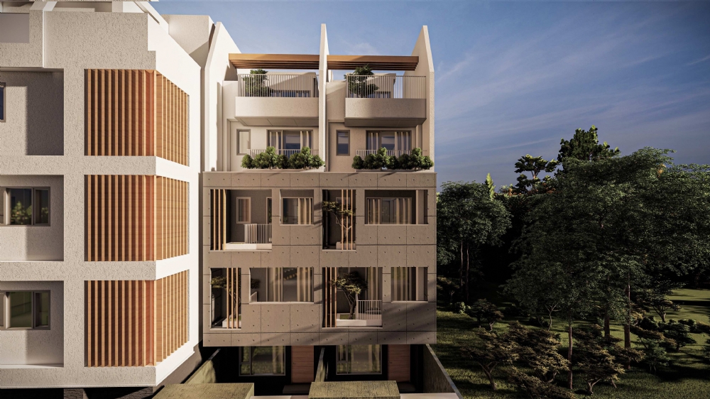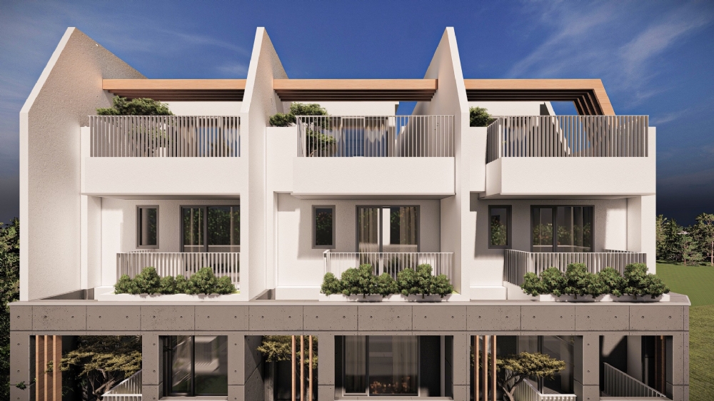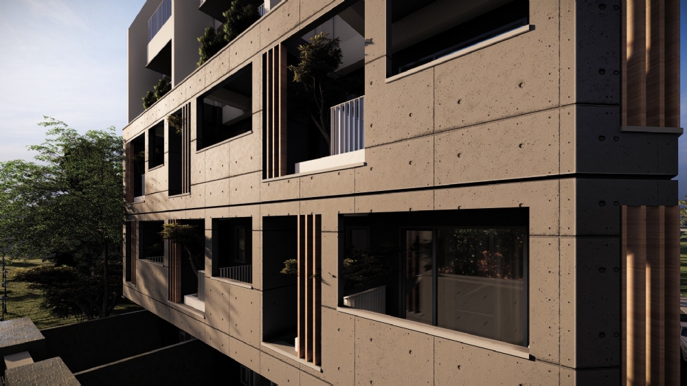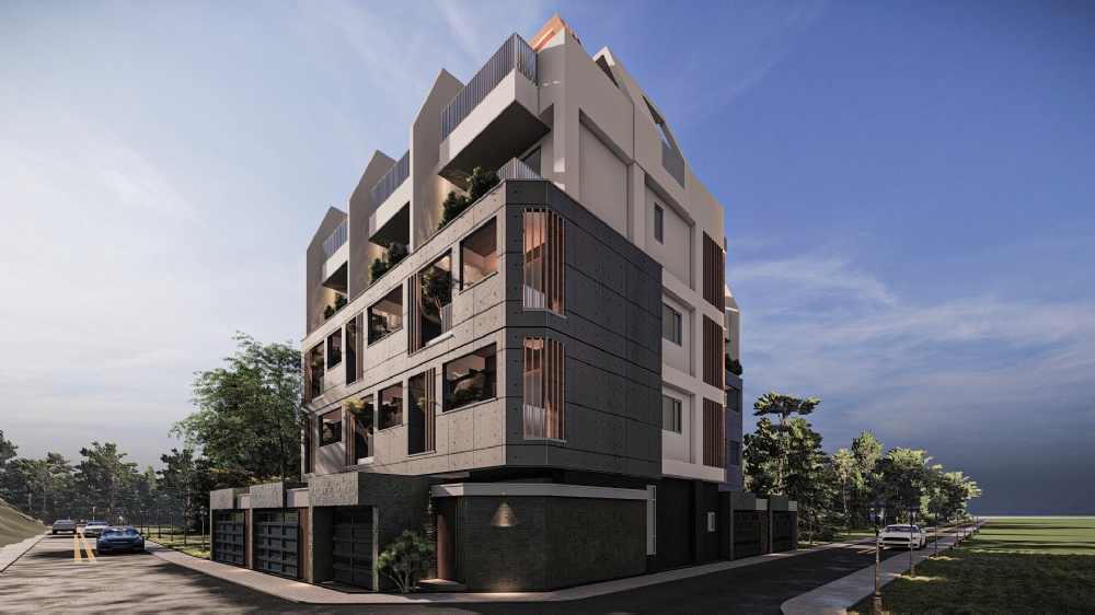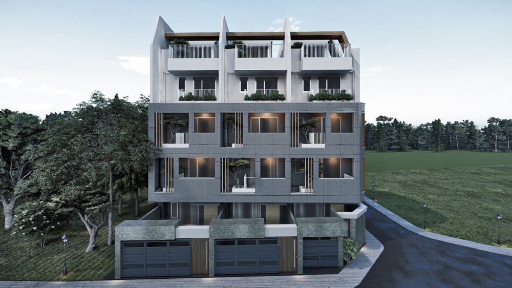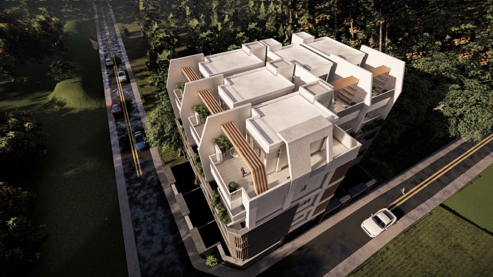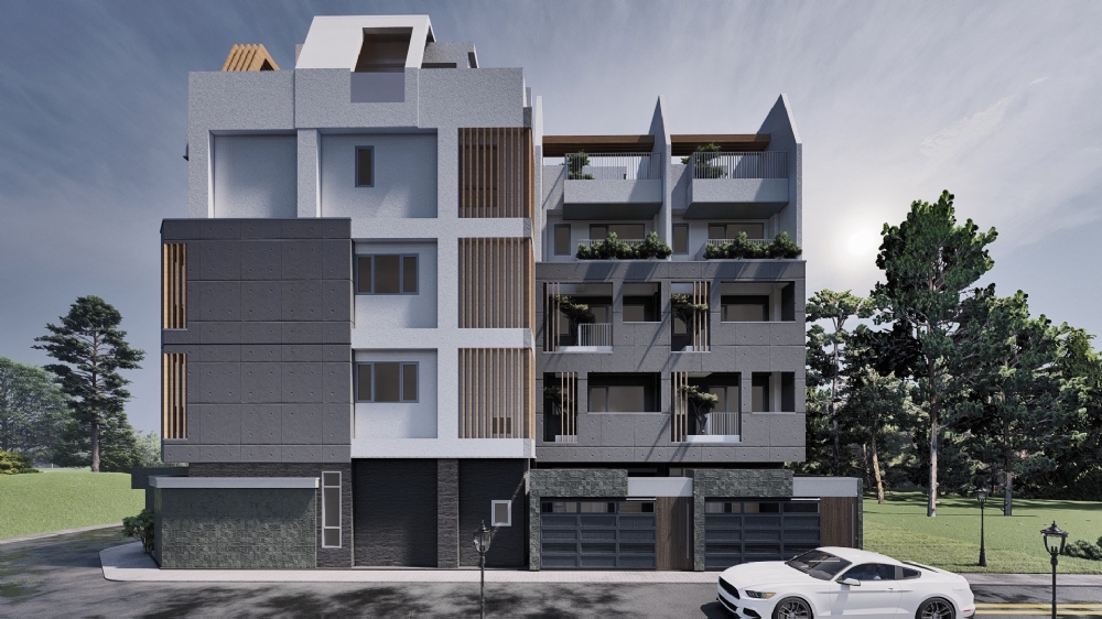 本建築位於密度較高的透天住宅區,基地雖劃分為五戶格局,但透過白色的基調、賦予清水模紋的如同岩石、洞窟的中介面,結合自然的垂直木紋、綠意的元素點綴,呈現以純真的基調回歸「原」野生活的意向,而整體的建築屋頂,冠以謙虛退縮的造型,不僅敞開了遼闊視野,並將光線更多的引入屋內,上縮的線條,描繪出山巒層疊的天際線,自然光藉由陽台的的開口、格柵的虛實,點亮生活空間。在微小的基地內自成一世界,構築出五戶本「原」為一家的社區意識及自明性,建築的空間運用不僅滿足生活機能,也對生活的想像添加豐富的色彩。